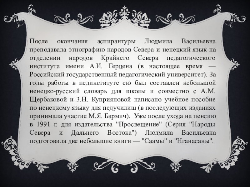 Слайд 12После окончания аспирантуры Людмила Васильевна преподавала этнографию народов Севера и ненецкий