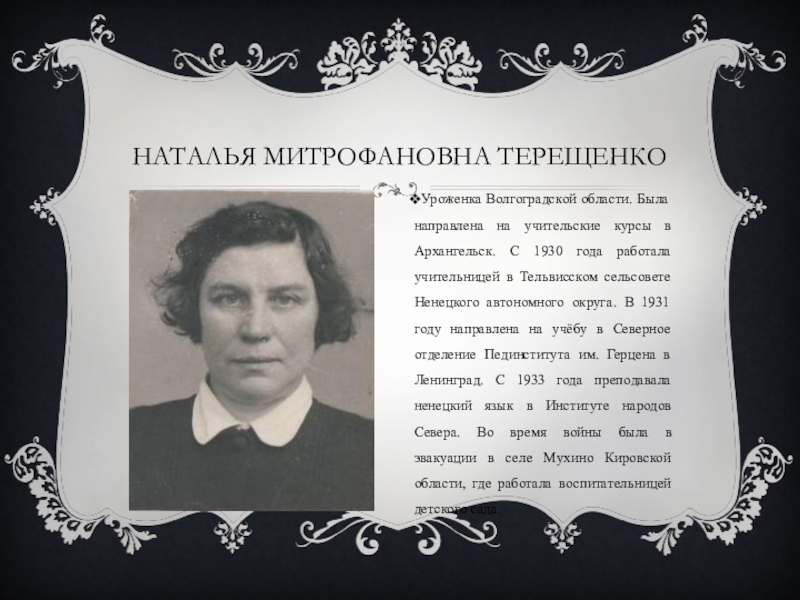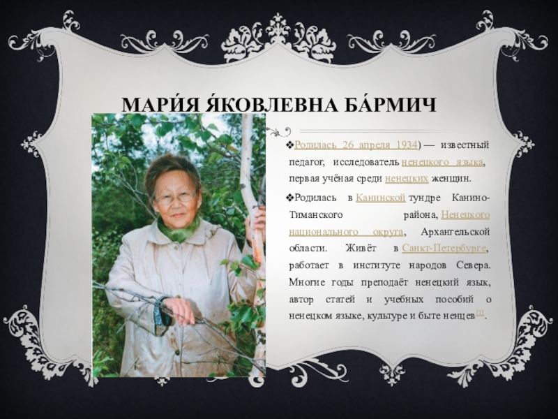 Родилась 26 апреля 1934) — известный педагог, исследователь ненецкого языка, первая
