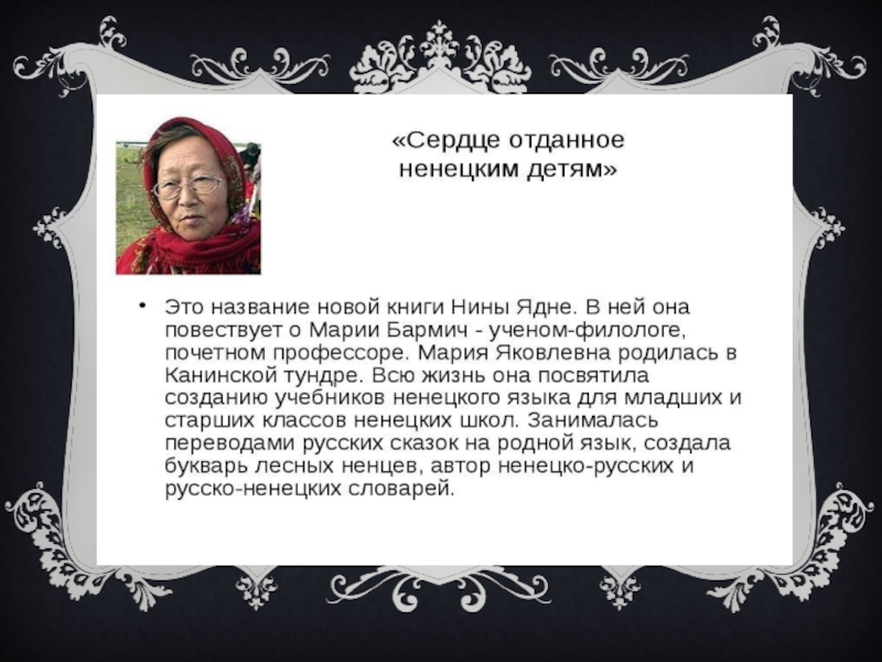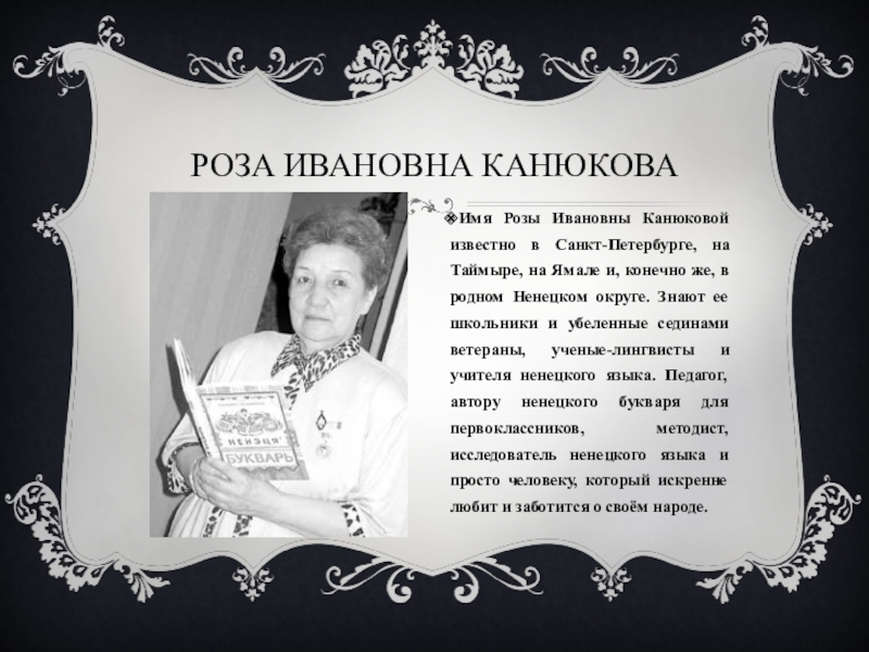 на Ямале и, конечно же, в родном Ненецком округе. Знают ее школьники и убеленные сединами ветераны, ученые-лингвисты и учителя ненецкого языка. Педагог, автору ненецкого букваря для первоклассников, методист, исследователь ненецкого языка и просто человеку, который искренне любит и заботится о своём народе.