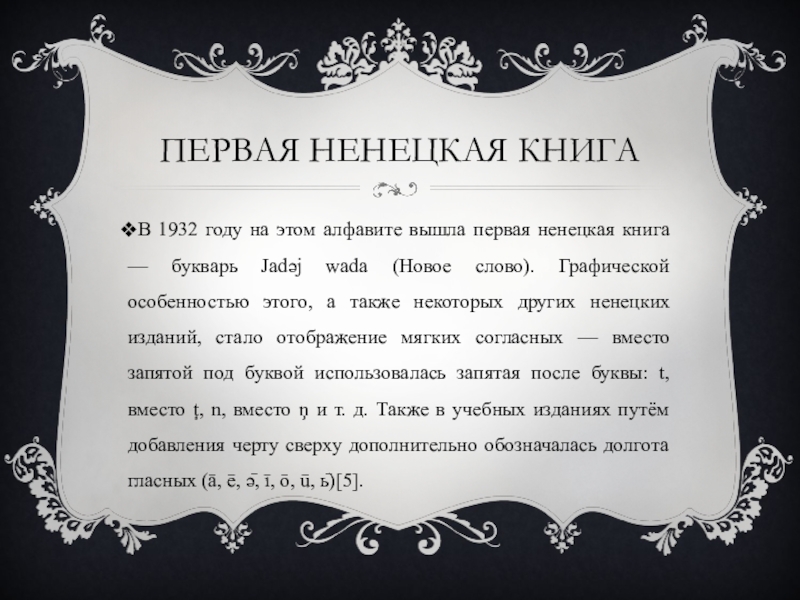 книга — букварь Jadəj wada (Новое слово). Графической особенностью этого, а также некоторых других ненецких изданий, стало отображение мягких согласных — вместо запятой под буквой использовалась запятая после буквы: t, вместо ț, n, вместо ņ и т. д. Также в учебных изданиях путём добавления черту сверху дополнительно обозначалась долгота гласных (ā, ē, ә̄, ī, ō, ū, ь̄)[5].