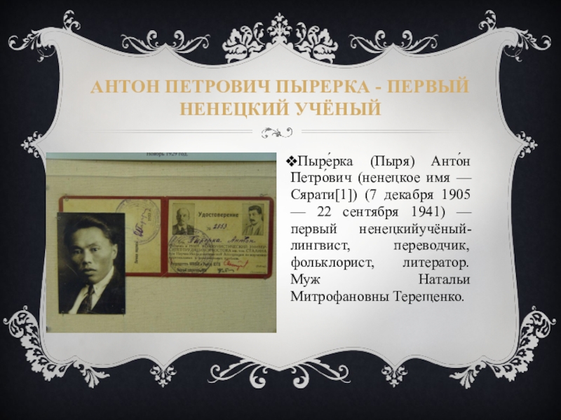 Слайд 13Антон Петрович Пырерка - первый ненецкий учёный