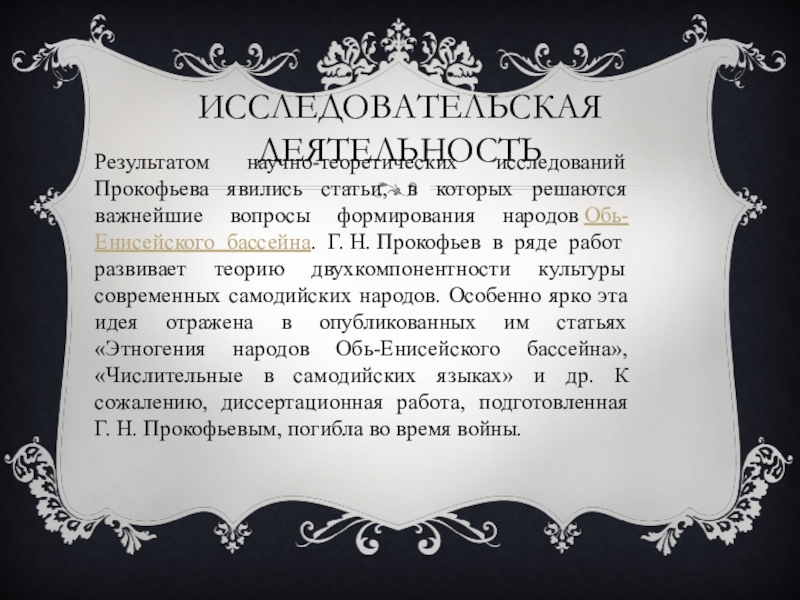 вопросы формирования народов Обь-Енисейского бассейна. Г. Н. Прокофьев в ряде работ развивает теорию двухкомпонентности культуры современных самодийских народов. Особенно ярко эта идея отражена в опубликованных им статьях «Этногения народов Обь-Енисейского бассейна», «Числительные в самодийских языках» и др. К сожалению, диссертационная работа, подготовленная Г. Н. Прокофьевым, погибла во время войны.