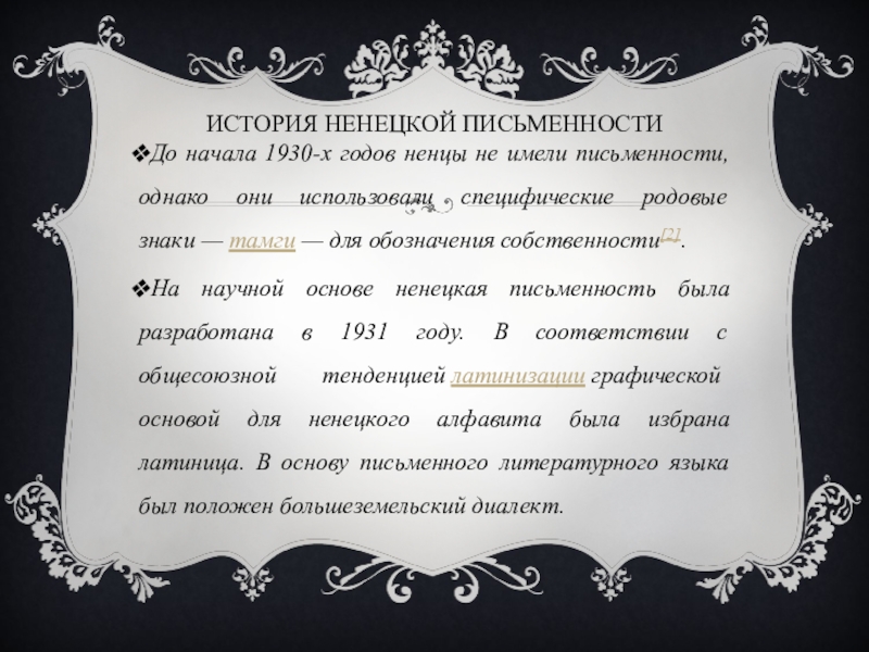На научной основе ненецкая письменность была разработана в 1931 году. В соответствии с общесоюзной тенденцией латинизации графической основой для ненецкого алфавита была избрана латиница. В основу письменного литературного языка был положен большеземельский диалект.