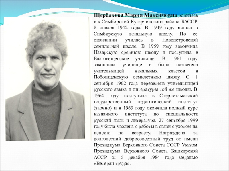 Щербакова Мария Максимовна родилась в х.Симбирский Кугарчинского района БАССР 8 января