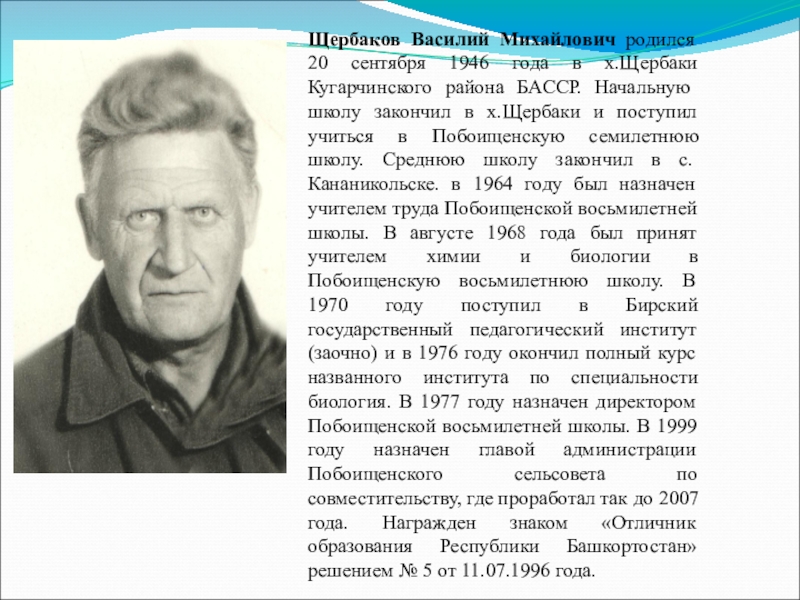Щербаков Василий Михайлович родился 20 сентября 1946 года в х.Щербаки Кугарчинского
