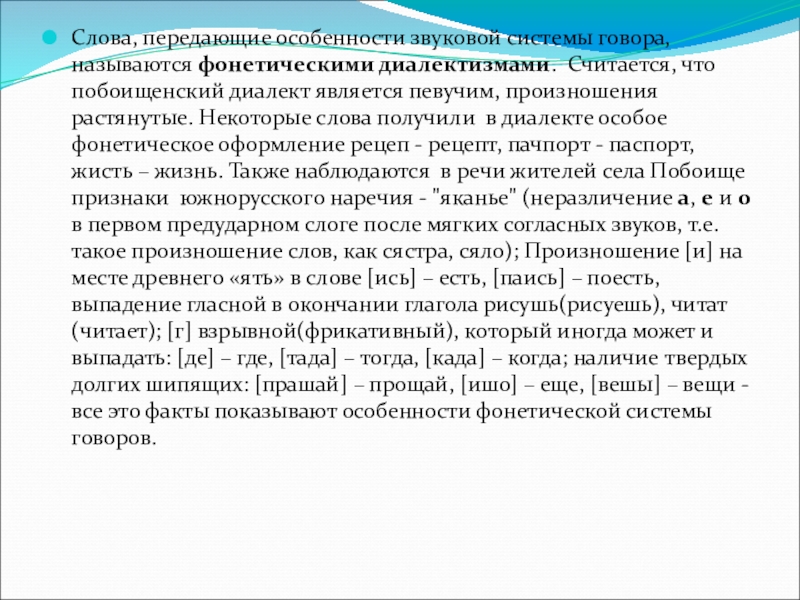 Слова, передающие особенности звуковой системы говора, называются фонетическими диалектизмами. Считается, что