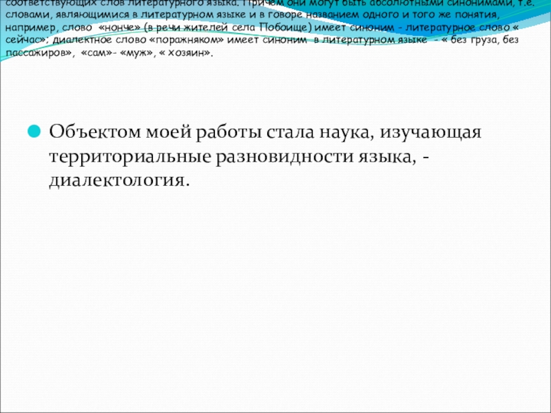 Объектом моей работы стала наука, изучающая территориальные разновидности языка, - диалектология.