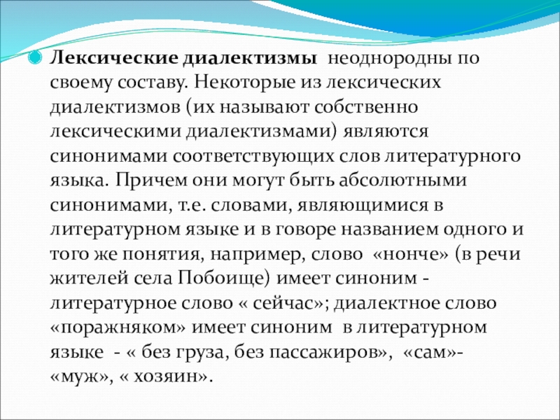 диалектизмы неоднородны по своему составу. Некоторые из лексических диалектизмов (их называют собственно лексическими диалектизмами) являются синонимами соответствующих слов литературного языка. Причем они могут быть абсолютными синонимами, т.е. словами, являющимися в литературном языке и в говоре названием одного и того же понятия, например, слово «нонче» (в речи жителей села Побоище) имеет синоним - литературное слово « сейчас»; диалектное слово «поражняком» имеет синоним в литературном языке - « без груза, без пассажиров», «сам»- «муж», « хозяин».