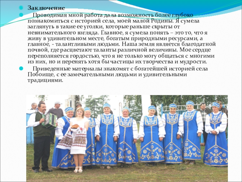 Проводимая мной работа дала возможность более глубоко познакомиться с историей села,