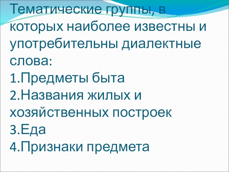 Слайд 22Тематические группы, в которых наиболее известны и употребительны диалектные слова: