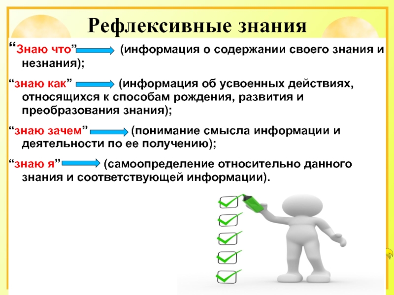 “знаю как” (информация об усвоенных действиях, относящихся к способам рождения, развития и преобразования знания);