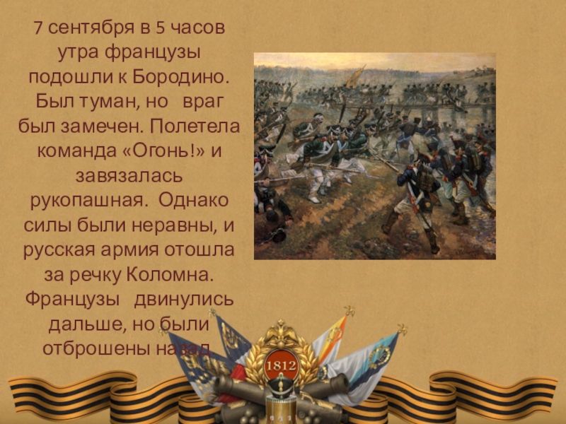 Слайд 67 сентября в 5 часов утра французы подошли к Бородино. Был