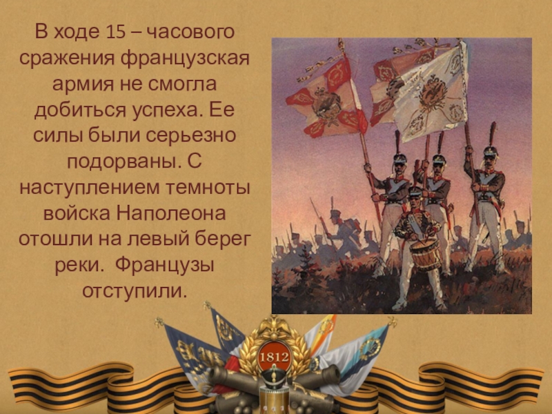 Слайд 8В ходе 15 – часового сражения французская армия не смогла добиться