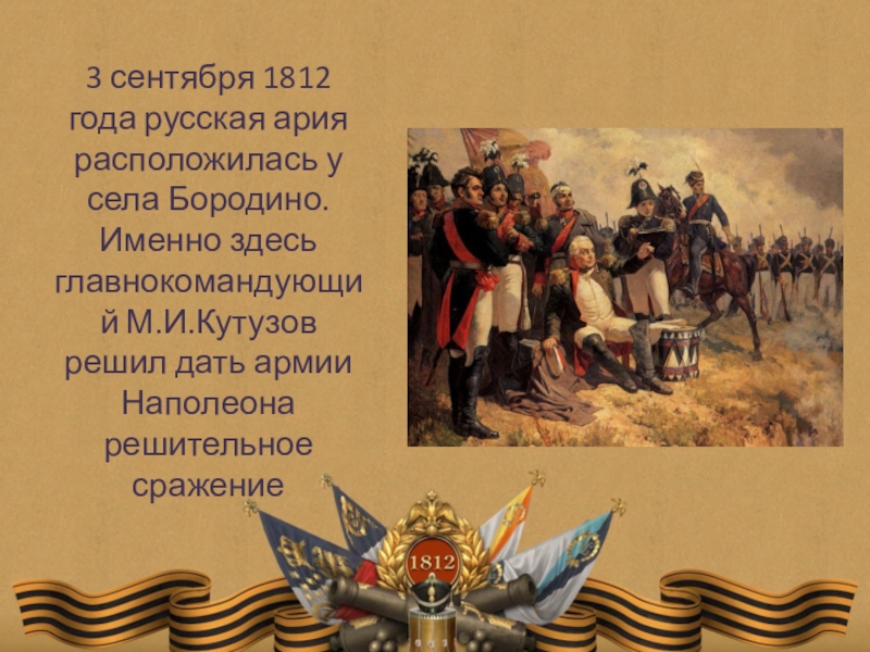 Слайд 53 сентября 1812 года русская ария расположилась у села Бородино. Именно