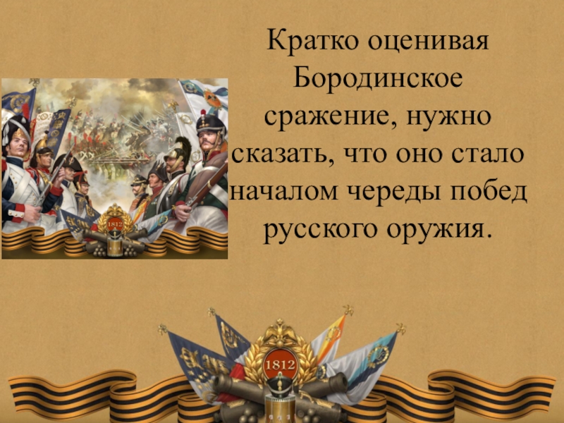 Слайд 9Кратко оценивая Бородинское сражение, нужно сказать, что оно стало началом череды побед