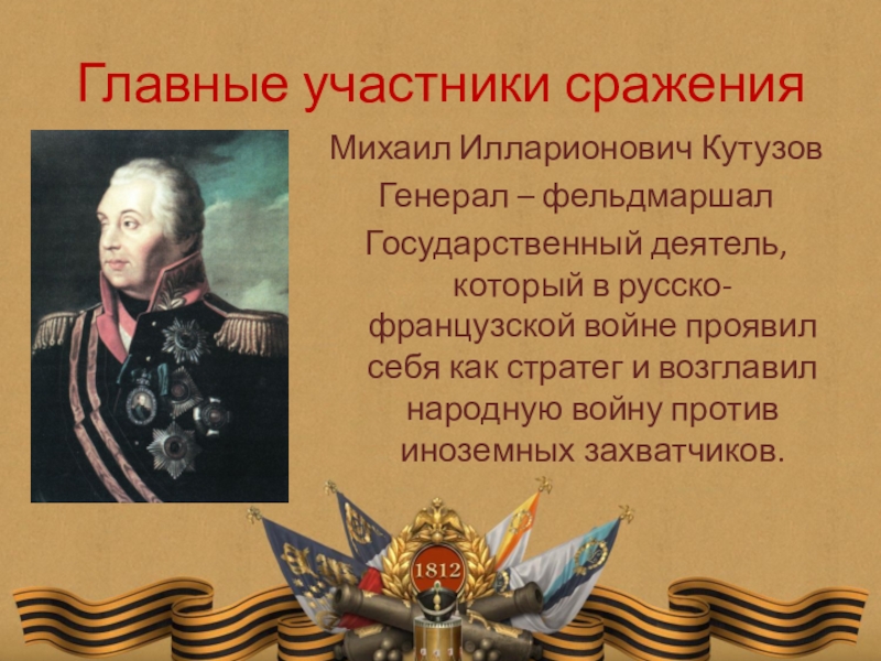 Главные участники сраженияМихаил Илларионович КутузовГенерал – фельдмаршалГосударственный деятель, который в русско-французской войне проявил себя как стратег и