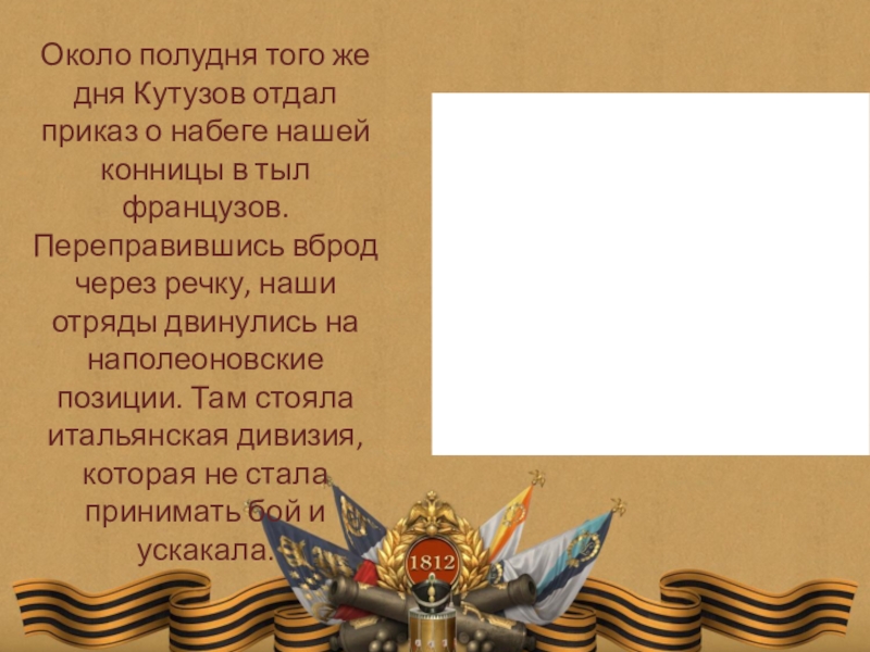 Слайд 7Около полудня того же дня Кутузов отдал приказ о набеге нашей