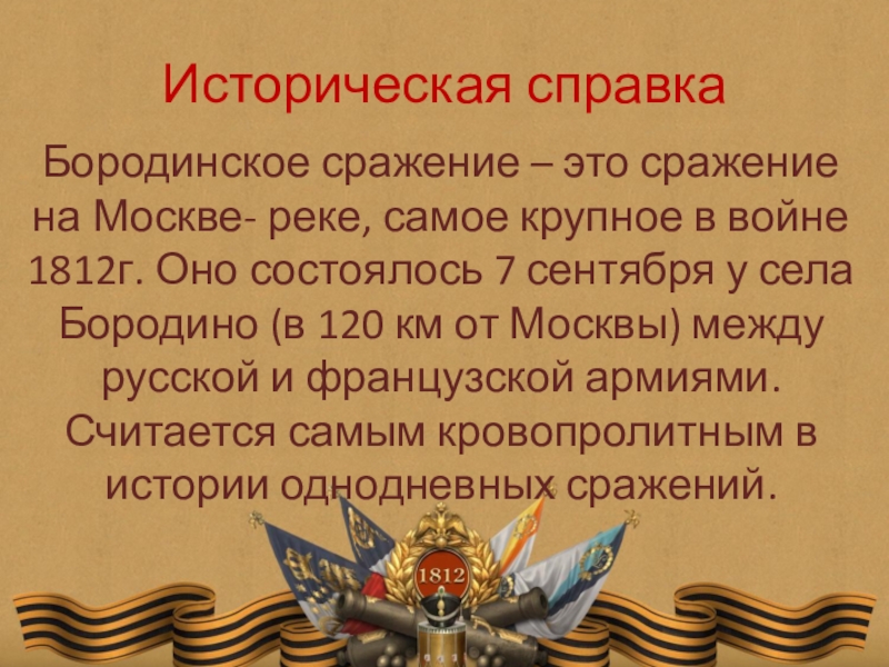 Историческая справкаБородинское сражение – это сражение на Москве- реке, самое крупное в войне 1812г. Оно состоялось 7 сентября у села Бородино (в 120 км от Москвы) между русской и французской армиями. Считается самым кровопролитным в истории
