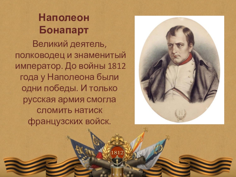 Наполеон БонапартВеликий деятель, полководец и знаменитый император. До войны 1812 года у Наполеона были одни победы. И