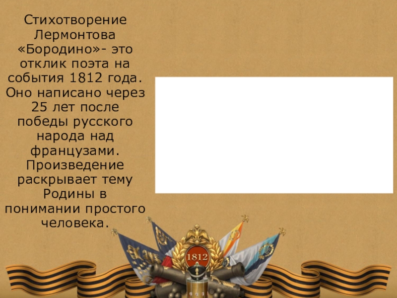 Слайд 10Стихотворение Лермонтова «Бородино»- это отклик поэта на события 1812 года. Оно