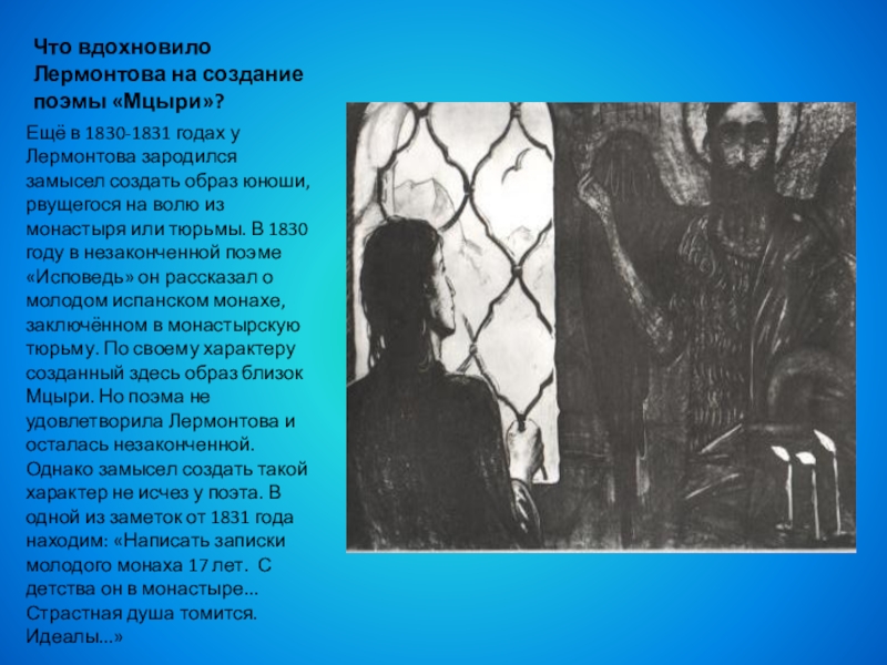 Слайд 3Что вдохновило Лермонтова на создание поэмы «Мцыри»?