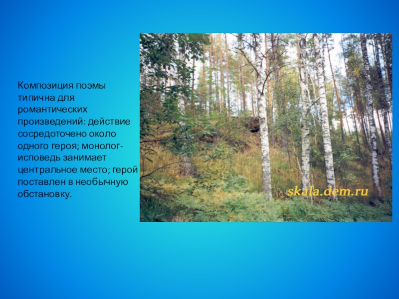 Слайд 9Композиция поэмы типична для романтических произведений: действие сосредоточено около одного героя;