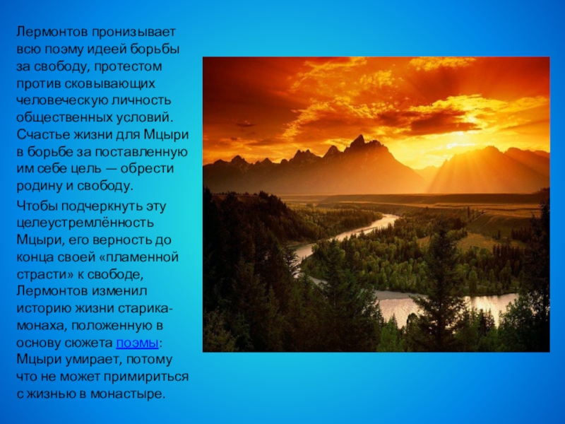 Слайд 10Природа в понимании Мцыри — это воплощение воли, неисчерпаемой силы, красоты