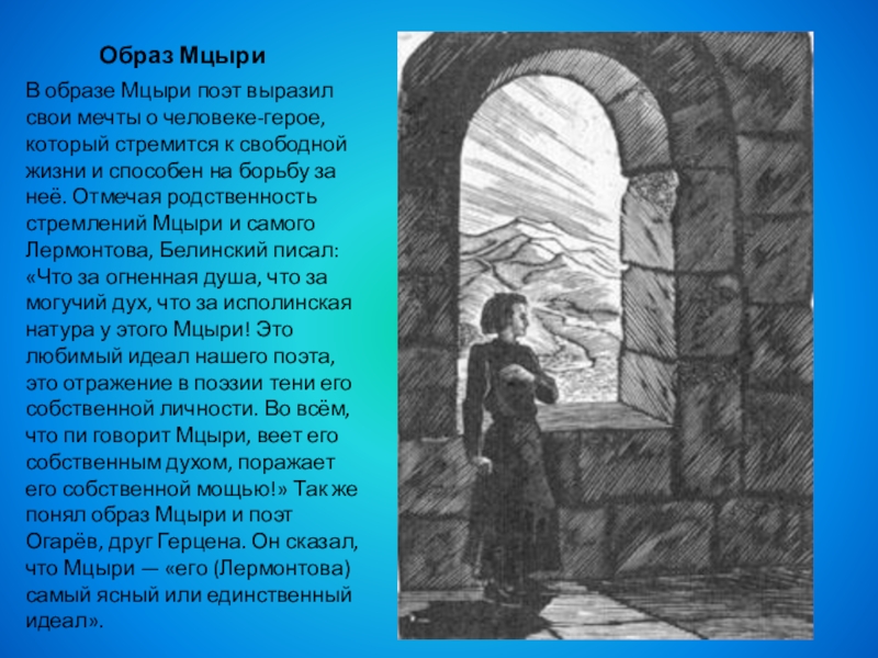 стремится к свободной жизни и способен на борьбу за неё. Отмечая родственность стремлений Мцыри и самого Лермонтова, Белинский писал: «Что за огненная душа, что за могучий дух, что за исполинская натура у этого Мцыри! Это любимый идеал нашего поэта, это отражение в поэзии тени его собственной личности. Во всём, что пи говорит Мцыри, веет его собственным духом, поражает его собственной мощью!» Так же понял образ Мцыри и поэт Огарёв, друг Герцена. Он сказал, что Мцыри — «его (Лермонтова) самый ясный или единственный идеал».