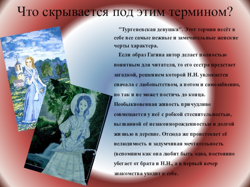 Если образ Гагина автор делает полностью понятным для читателя, то его сестра предстает загадкой, решением которой Н.Н. увлекается сначала с любопытством, а потом и самозабвенно, но так и не может постичь до конца. Необыкновенная живость причудливо совмещается у неё с робкой стеснительностью, вызванной её незаконнорожденностью и долгой жизнью в деревне. Отсюда же проистекает её нелюдимость и задумчивая мечтательность(вспомним как она любит быть одна, постоянно убегает от брата и Н.Н., а в первый вечер знакомства уходит к себе.
