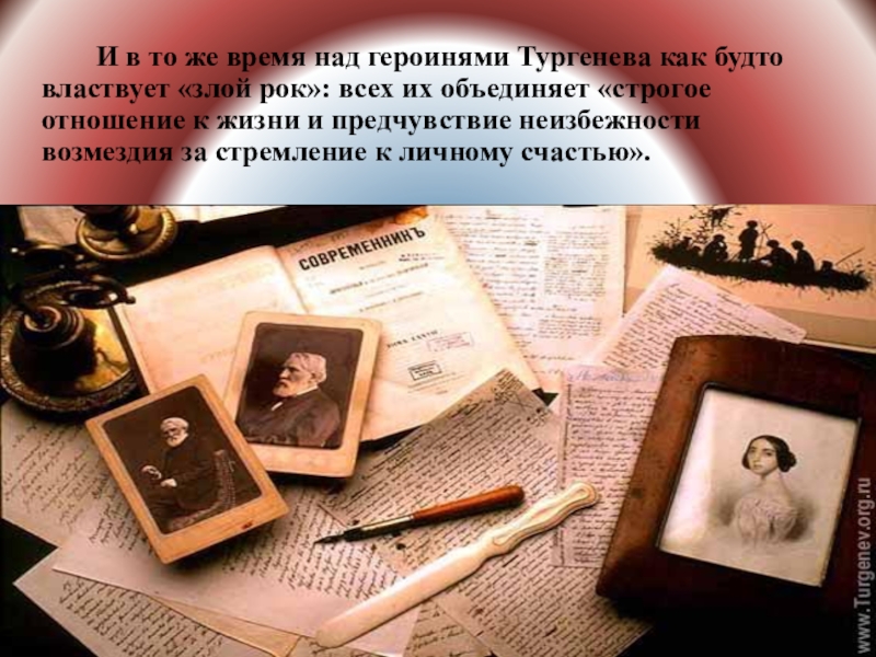 над героинями Тургенева как будто властвует «злой рок»: всех их объединяет «строгое отношение к жизни и предчувствие неизбежности возмездия за стремление к личному счастью».