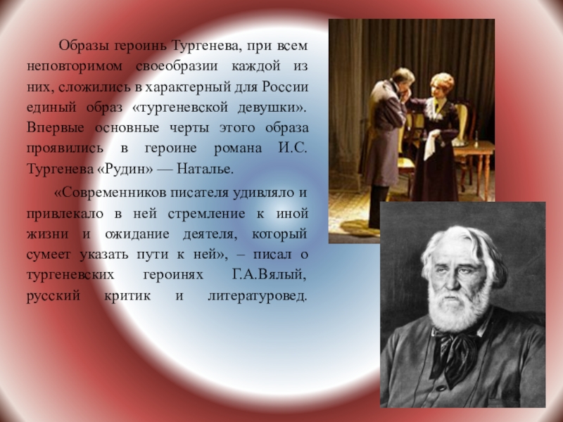 неповторимом своеобразии каждой из них, сложились в характерный для России единый образ «тургеневской девушки». Впервые основные черты этого образа проявились в героине романа И.С.Тургенева «Рудин» — Наталье.