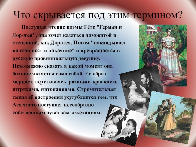 чтение поэмы Гёте "Герман и Доротея", она хочет казаться домовитой и степенной, как Доротея. Потом "накладывает на себя пост и покаяние" и превращается в русскую провинциальную девушку. Невозможно сказать в какой момент она больше является сама собой. Ее образ мерцает, переливаясь разными красками, штрихами, интонациями. Стремительная смена её настроений усугубляется тем, что Ася часто поступает несообразно собственным чувствам и желаниям.