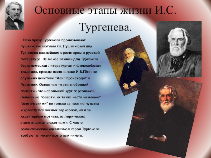 Тургенева пронизывают пушкинские мотивы т.к. Пушкин был для Тургенева важнейшим ориентиром в русской литературе. Не менее важной для Тургенева была немецкая литературная и философская традиция, прежде всего в лице И.В.Гёте; не случайно действие "Аси" происходит в Германии. Основные черты любовной повести - это небольшой круг персонажей. Любовные повести, их также часто называют "элегическими" не только за поэзию чувства и красоту пейзажных зарисовок, но и за характерные мотивы, из лирических становящиеся сюжетными. С чисто романтическим идеализмом герои Тургенева требуют от жизни всего или ничего.