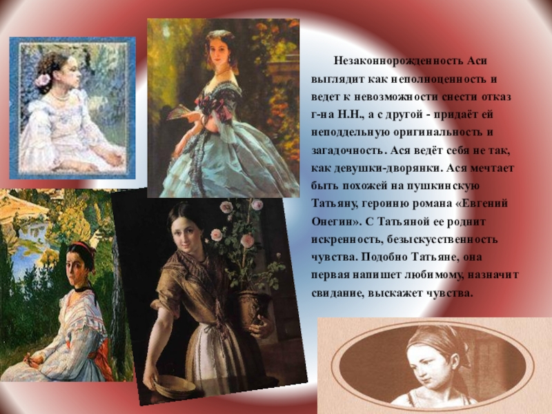 неполноценность и ведет к невозможности снести отказ г-на Н.Н., а с другой - придаёт ей неподдельную оригинальность и загадочность. Ася ведёт себя не так, как девушки-дворянки. Ася мечтает быть похожей на пушкинскую Татьяну, героиню романа «Евгений Онегин». С Татьяной ее роднит искренность, безыскусственность чувства. Подобно Татьяне, она первая напишет любимому, назначит свидание, выскажет чувства.