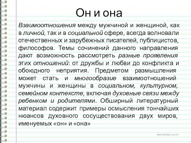 и в социальной сфере, всегда волновали отечественных и зарубежных писателей, публицистов, философов. Темы сочинений данного направления дают возможность рассмотреть разные проявления этих отношений: от дружбы и любви до конфликта и обоюдного неприятия. Предметом размышления может стать и многообразие взаимоотношений мужчины и женщины в социальном, культурном, семейном контексте, включая духовные связи между ребенком и родителями. Обширный литературный материал содержит примеры осмысления тончайших нюансов духовного сосуществования двух миров, именуемых «он» и «она»