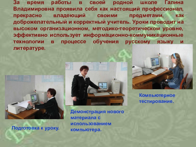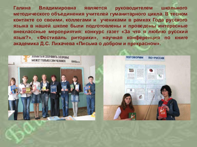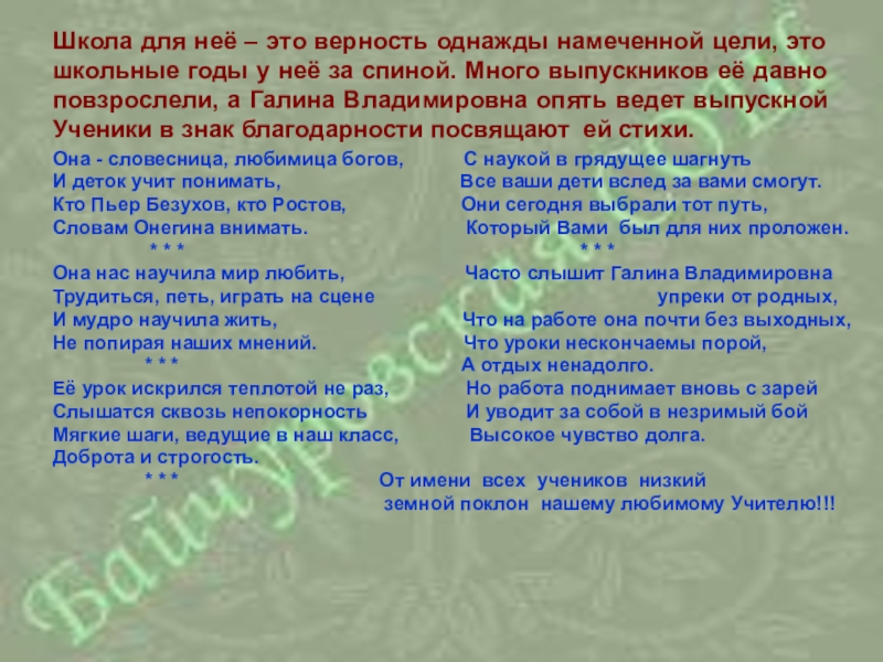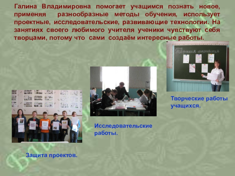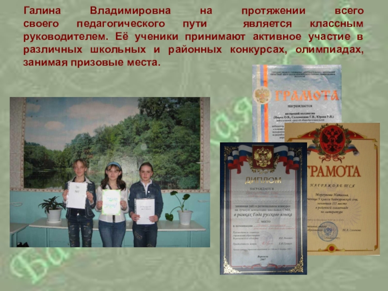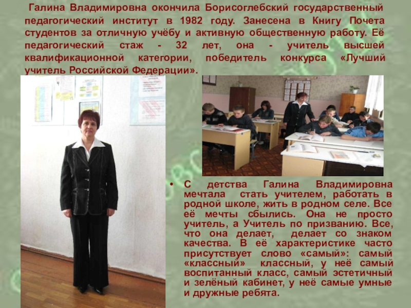 С детства Галина Владимировна мечтала стать учителем, работать в родной школе, жить в родном селе. Все её мечты сбылись. Она не просто учитель, а Учитель по призванию. Все, что она делает, делает со знаком качества. В её характеристике часто присутствует слово «самый»: самый «классный» классный, у неё самый воспитанный класс, самый эстетичный и зелёный кабинет, у неё самые умные и дружные ребята.
