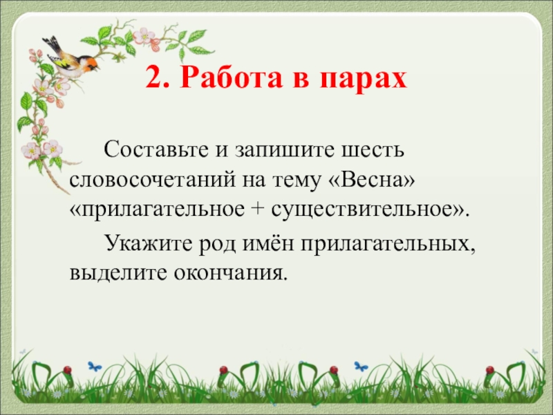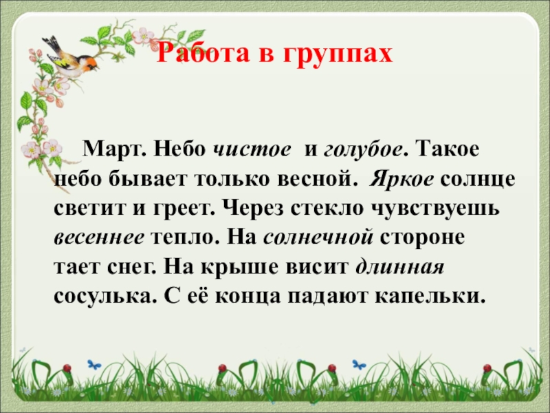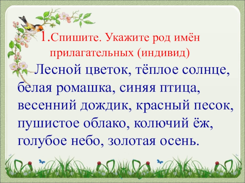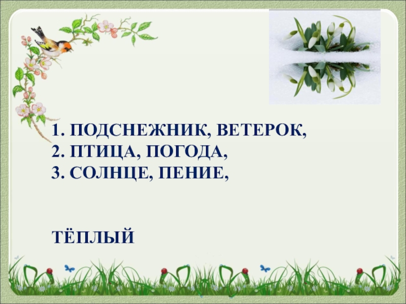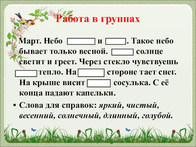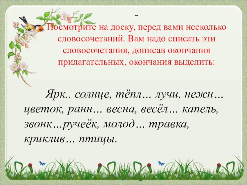 Ярк.. солнце, тёпл… лучи, нежн… цветок, ранн… весна, весёл… капель, звонк…ручеёк, молод… травка, криклив… птицы.