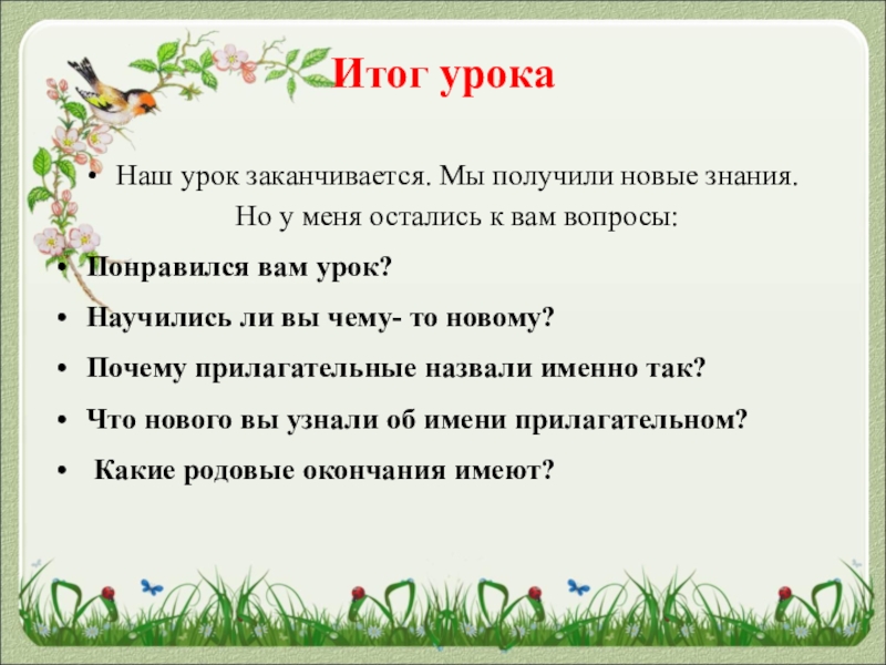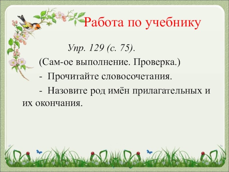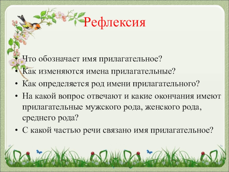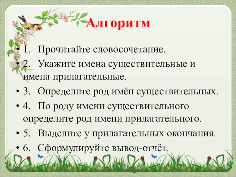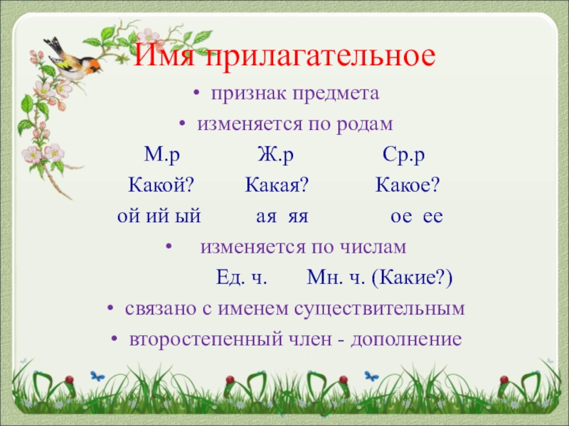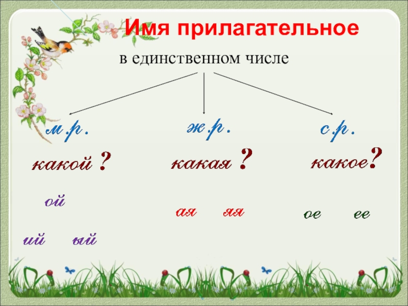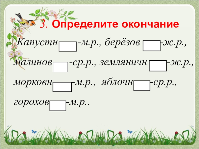 Ярк.. солнце, тёпл… лучи, нежн… цветок, ранн… весна, весёл… капель, звонк…ручеёк, молод… травка, криклив… птицы.