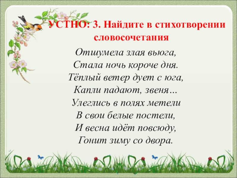 УСТНО: 3. Найдите в стихотворении словосочетания