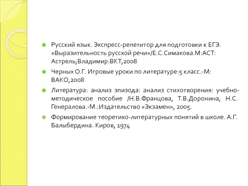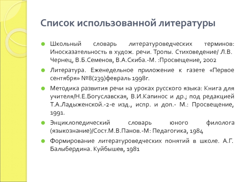 Литература: анализ эпизода: анализ стихотворения: учебно-методическое пособие /Н.В.Францова, Т.В.Доронина, Н.С. Генералова.-М.:Издательство «Экзамен», 2005.