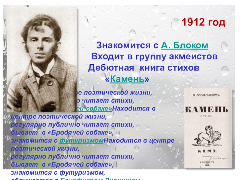 Находится в центре поэтической жизни, регулярно публично читает стихи, бывает в «Бродячей собаке»Находится в центре поэтической жизни, регулярно публично читает стихи, бывает в «Бродячей собаке», знакомится с футуризмомНаходится в центре поэтической жизни, регулярно публично читает стихи, бывает в «Бродячей собаке», знакомится с футуризмом, сближается с Бенедиктом Лившицем