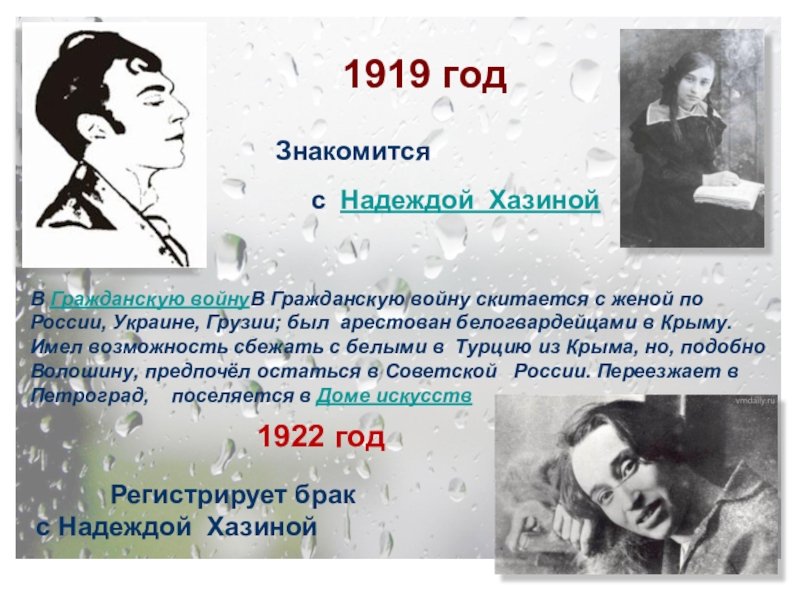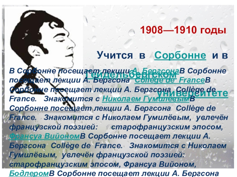 В Сорбонне посещает лекции А. БергсонаВ Сорбонне посещает лекции А. Бергсона Collège de FranceВ Сорбонне посещает лекции А. Бергсона Collège de France. Знакомится с Николаем ГумилёвымВ Сорбонне посещает лекции А. Бергсона Collège de France. Знакомится с Николаем Гумилёвым, увлечён французской поэзией: старофранцузским эпосом, Франсуа ВийономВ Сорбонне посещает лекции А. Бергсона Collège de France. Знакомится с Николаем Гумилёвым, увлечён французской поэзией: старофранцузским эпосом, Франсуа Вийоном, БодлеромВ Сорбонне посещает лекции А. Бергсона Collège de France. Знакомится с Николаем Гумилёвым, увлечён французской поэзией: старофранцузским эпосом, Франсуа Вийоном, Бодлером и Верленом.
