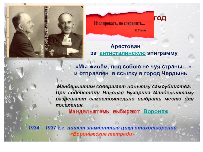 1934 – 1937 г.г. пишет знаменитый цикл стихотворений «Воронежские тетради»