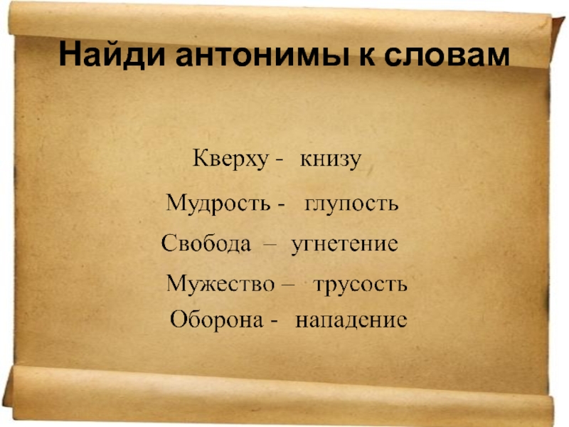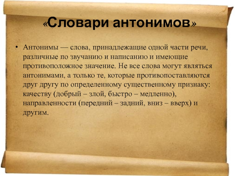 звучанию и написанию и имеющие противоположное значение. Не все слова могут являться антонимами, а только те, которые противопоставляются друг другу по определенному существенному признаку: качеству (добрый – злой, быстро – медленно), направленности (передний – задний, вниз – вверх) и другим.