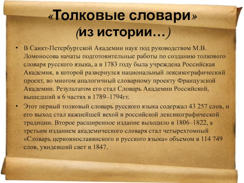 работы по созданию толкового словаря русского языка, а в 1783 году была учреждена Российская Академия, в которой развернулся национальный лексикографический проект, во многом аналогичный словарному проекту Французской Академии. Результатом его стал Словарь Академии Российской, вышедший в 6 частях в 1789–1794гг.