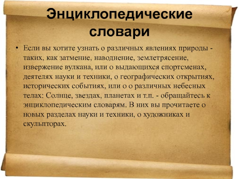как затмение, наводнение, землетрясение, извержение вулкана, или о выдающихся спортсменах, деятелях науки и техники, о географических открытиях, исторических событиях, или о о различных небесных телах: Солнце, звездах, планетах и т.п. - обращайтесь к энциклопедическим словарям. В них вы прочитаете о новых разделах науки и техники, о художниках и скульпторах.