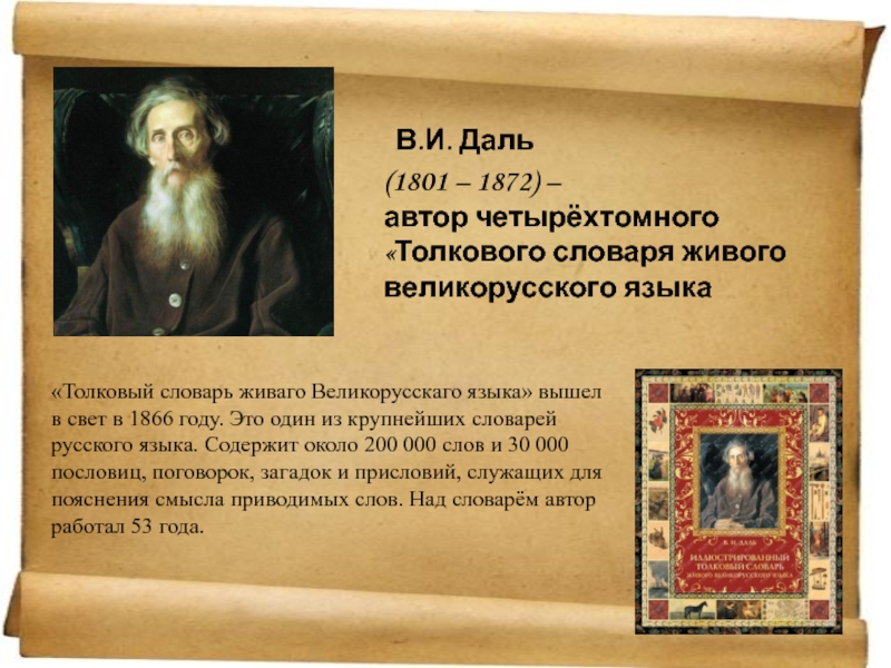 «Толковый словарь живаго Великорусскаго языка» вышел в свет в 1866 году. Это один из крупнейших словарей русского языка. Содержит около 200 000 слов и 30 000 пословиц, поговорок, загадок и присловий, служащих для пояснения смысла приводимых слов. Над словарём автор