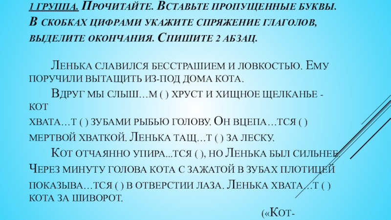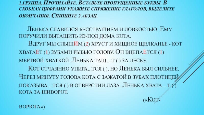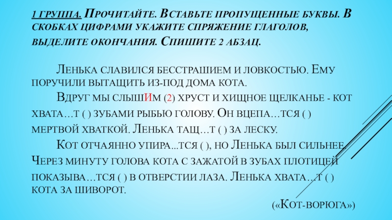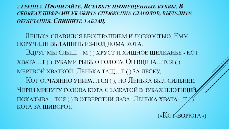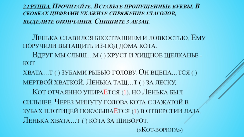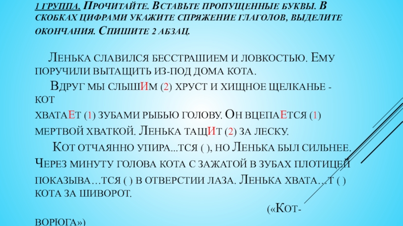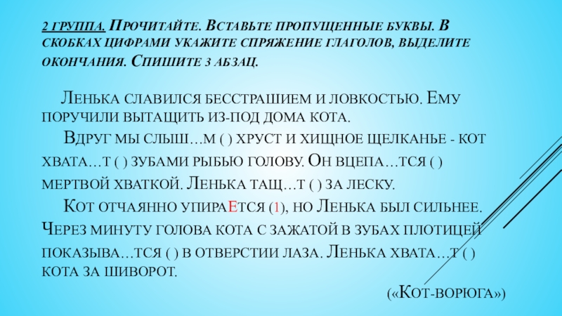 Кот отчаянно упирается (1), но Ленька был сильнее. Через минуту голова кота с зажатой в зубах плотицей показывается (1) в отверстии лаза. Ленька хвата…т ( ) кота за шиворот.