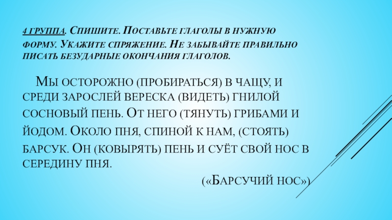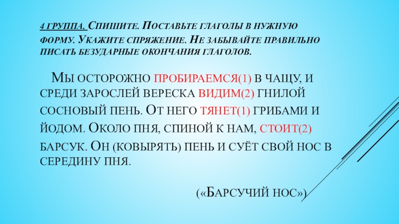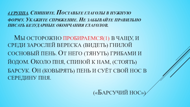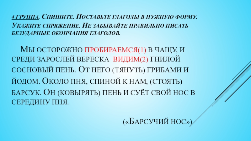 Мы осторожно пробираемся(1) в чащу, и среди зарослей вереска видим(2) гнилой сосновый пень. От него (тянуть) грибами и йодом. Около пня, спиной к нам, (стоять) барсук. Он (ковырять) пень и суёт свой нос в середину пня.