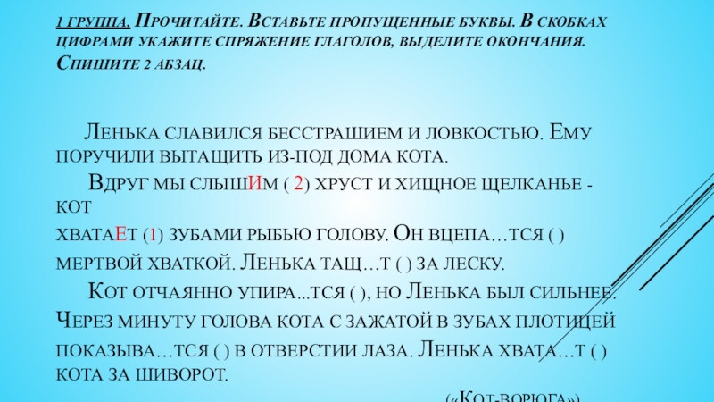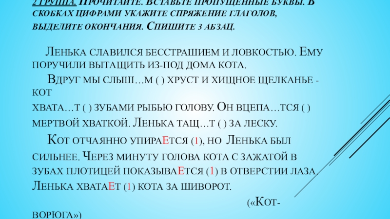 Слайд 172 группа. Прочитайте. Вставьте пропущенные буквы. В скобках цифрами укажите спряжение глаголов,
